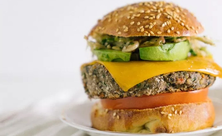12. Hambúrguer de grão-de-bico com guacamole: aqui, o hambúrguer é feito com 350 g de grão-de-bico cozido, meia cebola roxa, 2 dentes de alho, 1 raminho de manjericão, 1/4 de xícara de farinha de aveia, sal, pimenta-do-reino, páprica picante, azeite e raspas de 1 limão. A montagem, por outro lado, leva guacamole, queijo prato, tomate e pães de hambúrguer.