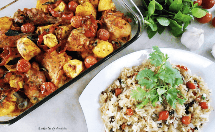 15. Sobrecoxas assadas com legumes: esse prato tem gostinho de almoço de domingo. Cada garfada é um sorriso e um quentinho no coração! Para sair da mesmice de só assar as sobrecoxas, acrescente alguns legumes – pode utilizar aqueles você já tem na geladeira. O resultado é uma mistura deliciosa.
