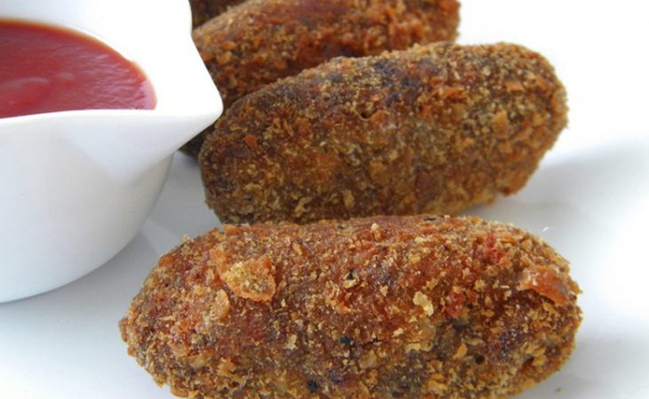 Cebola, alho, molho de tomate, caldo de carne, carne moída, sal, pimenta, água, farinha de trigo e farinha de rosca são os ingredientes que compõem esse delicioso croquete de carne moída que não leva ovos! Para deixar ainda mais gostoso, sirva com ketchup, mostarda ou algum molho de pimenta!