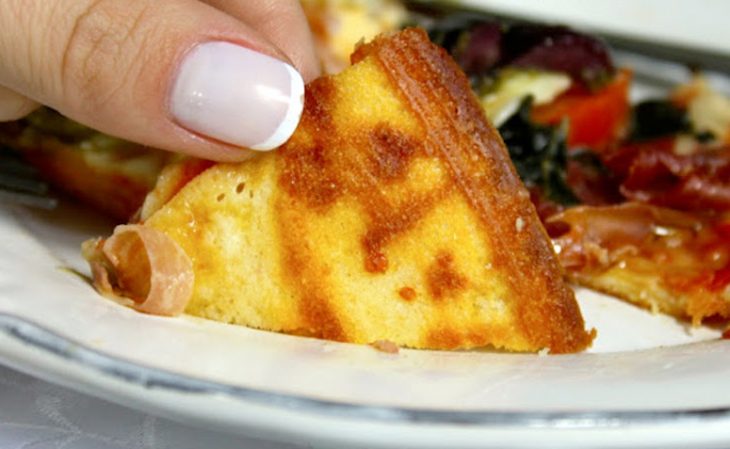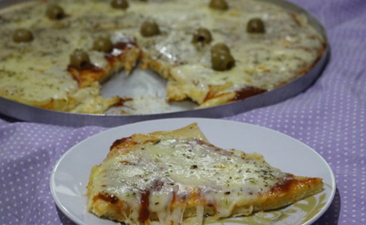 Aqui, a pizza é totalmente feita na frigideira – até o preparo da massa! Então, unte a sua frigideira muito bem e misture os ingredientes até formar uma massa lisa e bem bonita. Depois, é só deixar assar em fogo baixo por aproximadamente quinze minutos ou até que fique douradinha!