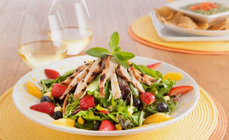 1. Salada de frango colorida: feita com alface, rúcula, tomate-cereja, mussarela e orégano, esta salada é superfresquinha, saudável e apetitosa! Tempere da forma como preferir e traga uma enorme variedade de cores para sua refeição preparando esta receita.